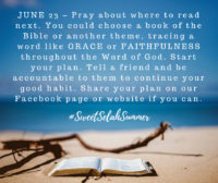 Well dear ones. We are DONE! I hope you enjoyed pondering the little word "selah" with me this June. I learned SO much! Feel free to comment below or email me, to let me know what you learned: sharon@sweetselah.org. May God bless you with many wonderful "selah" moments with Him this summer! Love, Sharon Read more »