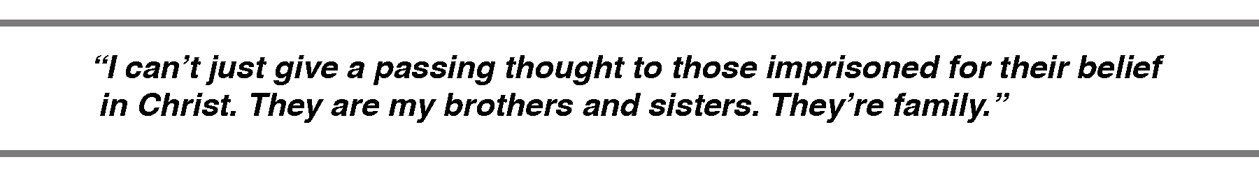 As if you were there yourself. I can’t just give a passing thought to those imprisoned for their belief in Christ. They are my brothers and sisters. They’re family. I am to feel for them, hurt for them, empathize with their pain. “My” pastor is separated from his beloved wife and one son. He gets occasional phone calls but is not allowed to speak of Jesus with them. His church has been disbanded, and he can’t ask how the congregation he served is doing. He’s alone. He may be subjected to torture, hard work beyond his ability to endure, sickness, abuse. I don’t know, but when I pray, I imagine, and enter into the pain as best I can.