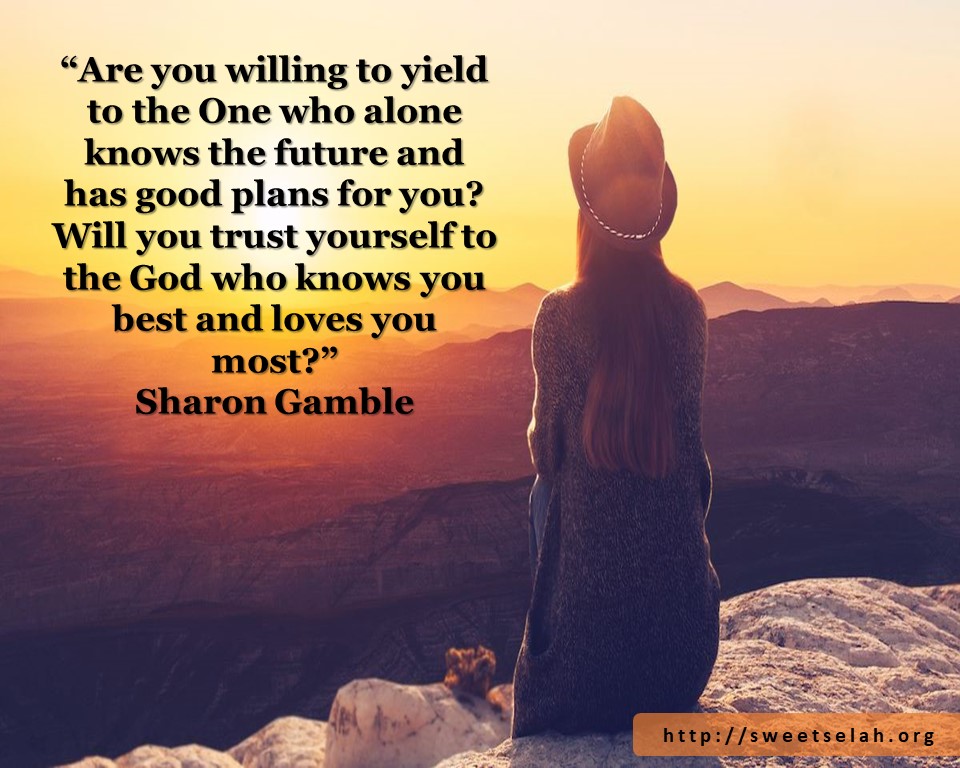 How about you? Are you willing to totally yield to the One who alone knows the future and has good plans for you? Will you trust yourself to the God who knows you best and loves you most? When we turn our lives over to God, all that happens is used for His good purposes. The hard times have meaning because He shows His power and glory through them—and through our responses to them. He brings from pain and piercings a beauty that is deep and rich and poignant. Only God can do this with our messy lives!