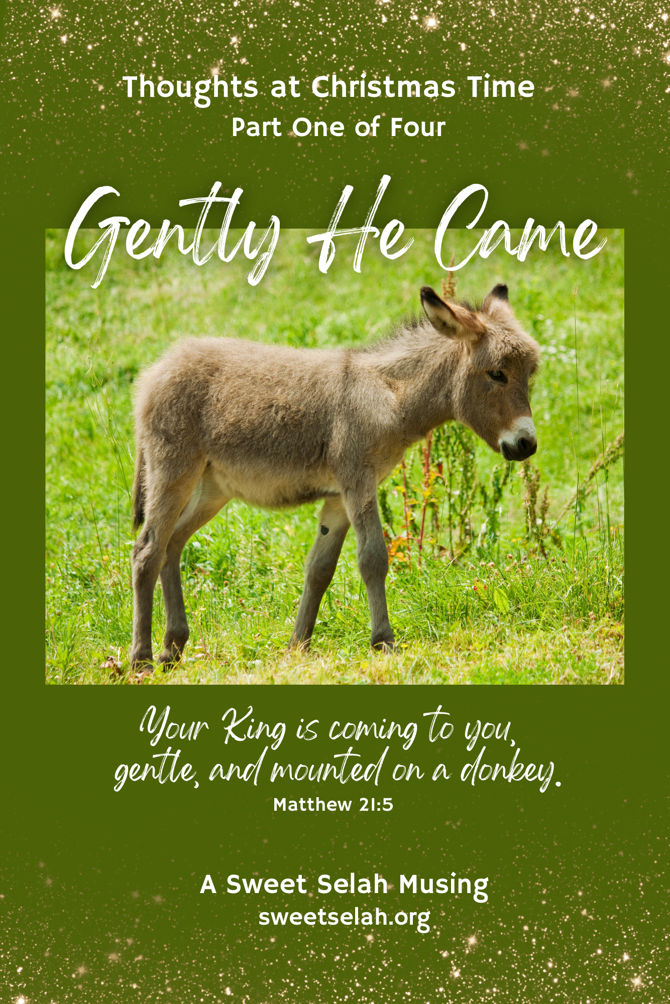 Even His triumphal entry into Jerusalem, predicted by Old Testament prophets, was gentle. No war horse and armored cavalcade for Him. No. A little donkey carried Him toward the great sacrifice He chose to make on our behalf. As Matthew said in our verse above, quoting from Zechariah 9:9, “… your King is coming to you, gentle …” (NCV). As we reflect on Jesus’ entrance into the world over 2000 years ago, the question we all must answer is this: Will we bow before the gentle King of kings, who came to rescue us?