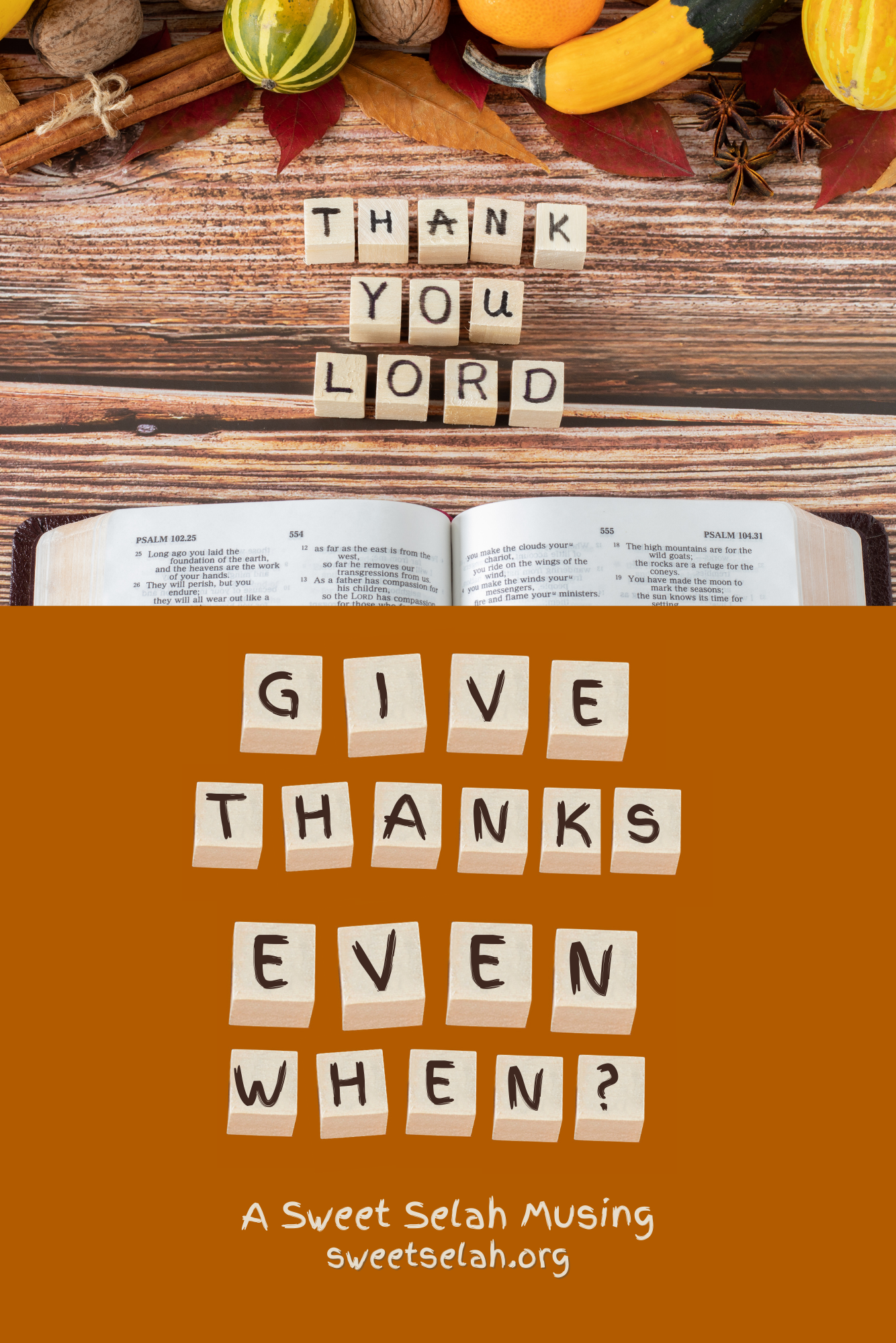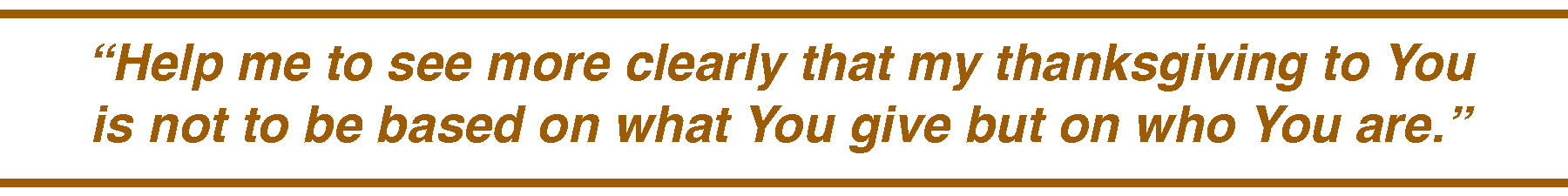 Job, the man known most to suffer, short of Christ’s suffering, didn’t speak these exact words. Still, his message was the same: “Shall we indeed accept good from God, and shall we not accept adversity?” (Job 2:10b). Out of a thankful heart, his life motto became, “Blessed be the name of the LORD” (Job 1:21b). In the New Testament, giving thanks is a common theme, one that is to be unconditional—not to be given “only when” or “only if” but given in and for all things. Wow! Is that ever hard to do sometimes?!