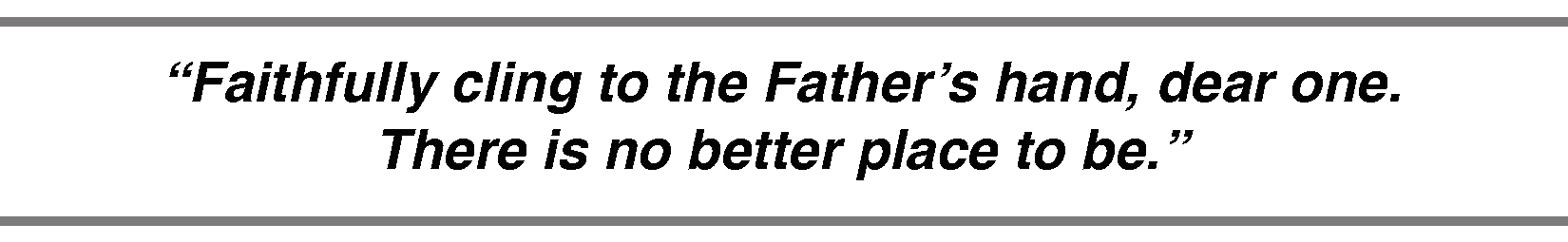 Heavenly Father, how I thank You for the picture You give in Scripture of Your big hand reaching down and gripping mine. Help me, Lord, to cling. I don’t want to wander off and leave Your side. Keep me close and comfort me when I’m feeling undone. Thank You that Your love for me never depends on my appearance or abilities. You loved me before I even knew You. Take hold of my hand, dear Lord, and never let me stray. In Jesus’ Name, Amen.