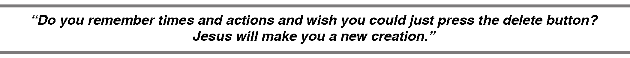 Do you have regrets today? Do you remember times and actions and wish you could just press the delete button? Well … in Him, Jesus will make you a new creation, and He will take all those mistakes, all those unwise choices, all those regrettable moments and make them all new again. He may allow us to experience the consequences of some of our choices, but He promises to take them all and use them for the new. He won’t waste them, and He won’t leave us to walk through it alone. He’s right there with us, living in and through us.
