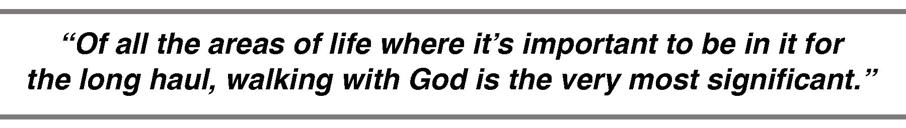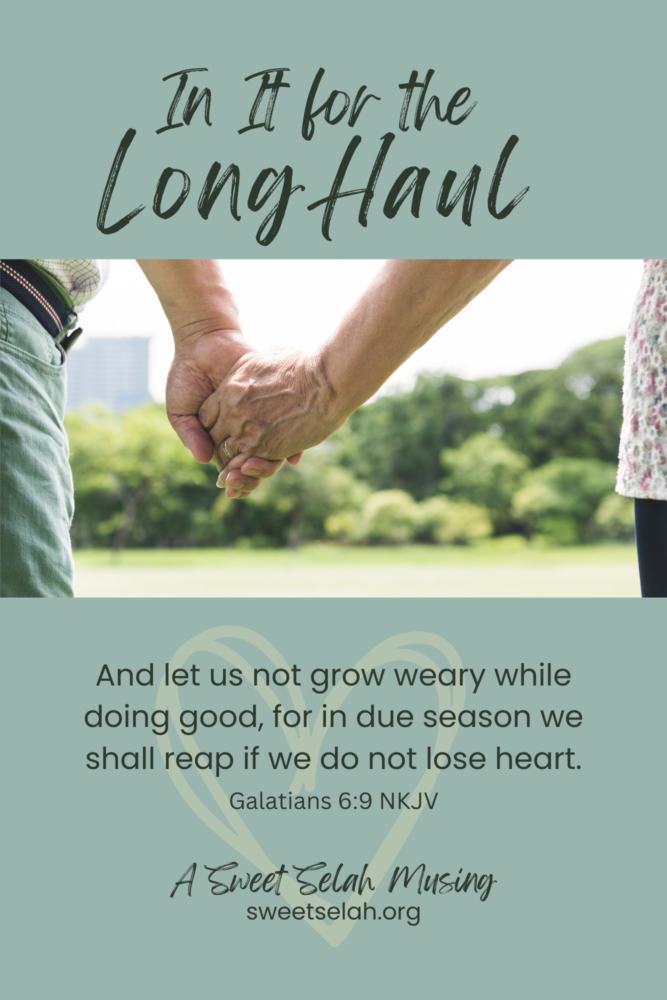 Of all the areas of life where it’s important to be in it for the long haul, walking with God is the very most significant. We commit to Him initially, and it’s a honeymoon at first. What a joy to be forgiven of our sins! How marvelous to be loved by the One who made us! But as time goes on and the euphoria wears off, we are tempted to become indifferent to the God who died for us, incredible as that sounds. Meeting with Him in prayer and Bible reading becomes more of a chore, as our self-centeredness whispers to us about our warm bed and the need for more sleep! It’s hard to choose church each week. It’s not easy to forgive. Yet each of these disciplines in the long haul yields such beautiful benefits. Oh, let us not grow weary of doing good. The harvest is beautiful when we build into our lives those patterns of behavior that keep us close to our loving Savior. Let’s be in it for the long haul.
