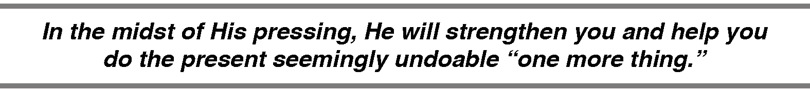 In the midst of His pressing, He will strengthen you and help you do the present seemingly undoable “one more thing.” And in His perfect time, He will give you that much-needed rest for your body and for your soul.