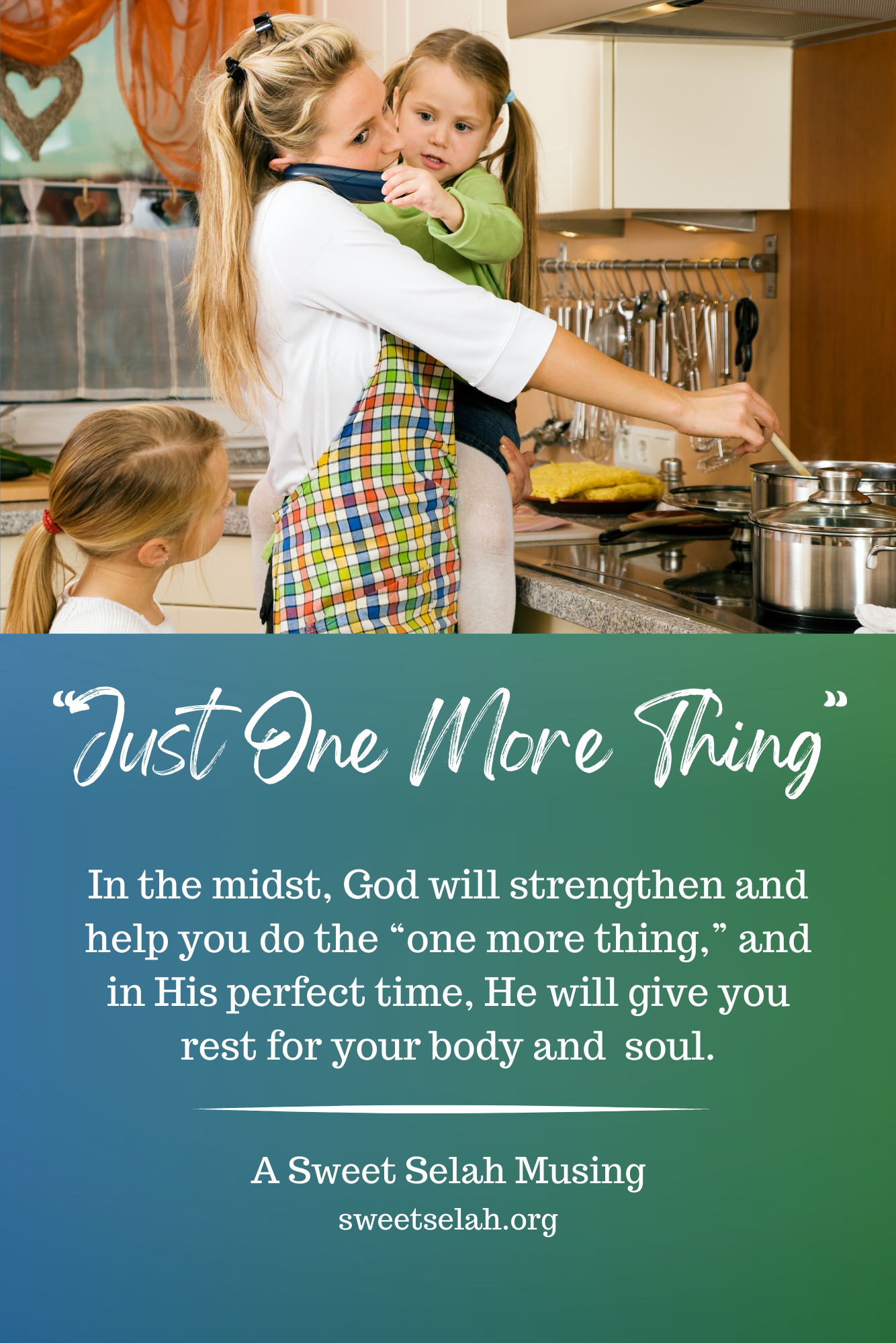 Father, thank You for work to do. You know how tired we get, how sometimes putting one foot in front of the other seems impossible. Yet, You give us the strength to do all You call us to do. Help us to see clearly what task is really from You and not ones we’re picking up that You have not meant for us to tackle. Thank You for strengthening and sustaining us through all of life’s “just one more thing.” I love You, Lord!