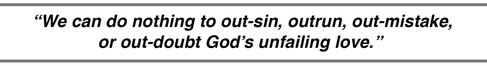 Unlike all the other things which end or fail, even the good things in today’s verse, God’s kind of love stays the course. We can do nothing to out-sin, outrun, out-mistake, or out-doubt God’s unfailing love. It is eternal, perfect, whole and complete, lineless, and stringless. It cannot be earned; it is a gift.