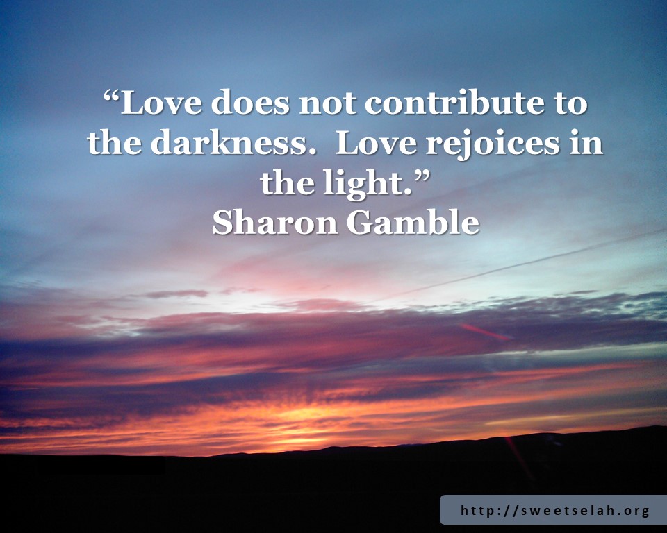 Love is not weak. Love wants the very best for others. Love wants truth and justice and righteousness to flourish. Love does not contribute to the darkness. Love rejoices in the light. This is hard. It’s awkward to stop someone from speaking ill of another. As a Christian, it’s scary to share how we perceive good and evil. We’re never to lose sight of the need to communicate hard things with kindness and patience and respect. So … losing our temper and shouting is also not the correct response! Love is not complicit in allowing evil.