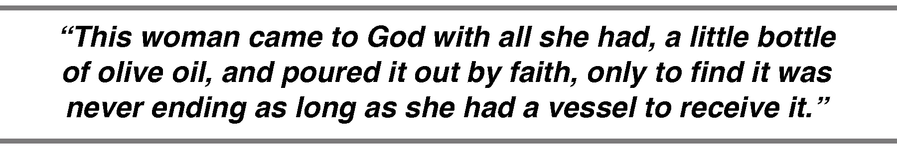 In this beautiful story, it would be easy to merely get caught up in the way God provided for this family. However, it’s important to remember that oil is always a symbol of the Holy Spirit in the Bible—the presence of God. This woman came to God with all she had, a little bottle of olive oil, and poured it out by faith, only to find it was never ending as long as she had a vessel to receive it. Her actions revealed her faith and desire, but God alone poured Himself out as the blessing and provision for her overwhelmed and burdened heart.