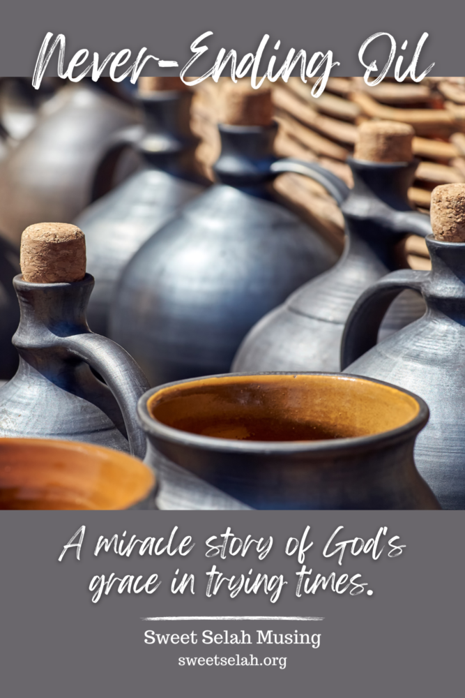 The air smelled sweet as she poured the olive oil into one of many large vessels in the dim room. Mingled with the aroma was the memory of her husband’s warm fingers touching her forehead as he anointed her with oil. But now he was cold in a newly-sealed tomb, and his creditor was threatening to take her boys as slaves. Her fingers ached as much as her heart. For a moment, she relaxed the hand wrapped tightly around the little jar. Then, she gripped it and shook the last drops from the bottle. That large urn was finally full. Amazed, she stared at the round, golden ripples caused by the last few drops of oil.