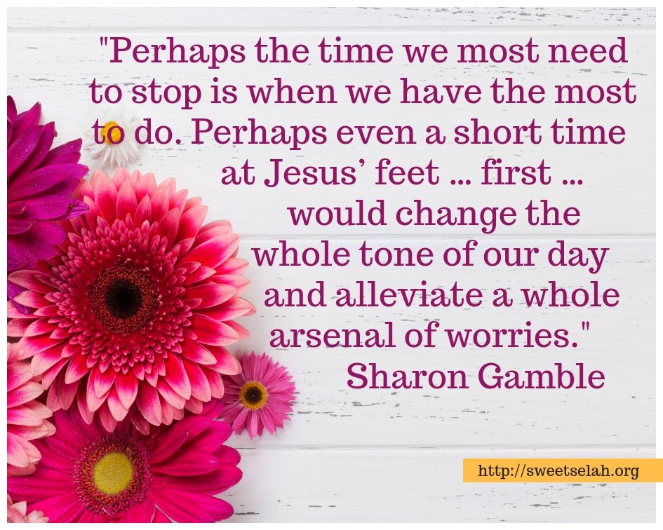 As I’ve pondered this story, I’ve come to realize that it’s in the busiest times I need most to stop. Just like Martha needed to do that “one thing,” meet first with Jesus, so do I. We all do. It’s hard. Louder voices cry for attention. Yet, when I make the choice to sit at Jesus’ feet each morning, even briefly, and hear from Him, my days go more smoothly. When I choose to “run away” on a Sweet Selah Day, spending precious time with God in prayer and study and quiet, I discover I’m better able to cope with all the craziness of life. The purpose of Sweet Selah Ministries is to encourage others—and myself—to take the time to stop. We need reminding.