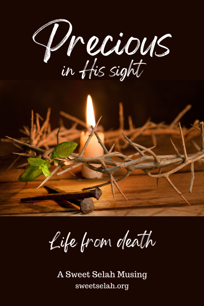 And still, I see another death that is “precious” to God, the dying to self that the believer does over and over again every single moment of every single day, as we yield ourselves to Him. Every time we set aside our wants for what He desires, we die to self and live to God. “I beseech you therefore, brethren, by the mercies of God, that you present your bodies a living sacrifice, holy and acceptable to God, which is your reasonable service” (Romans 12:1 NKJV).