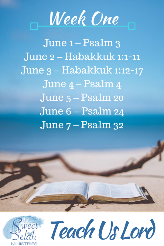 Are you ready? June 1st is right around the corner. Here are your readings for the first week. We'll be reading Psalms on the weekdays and Habakkuk on the weekends. These are the only two books of the Bible that contain our word for this study: "selah." May God speak to you through His Word, dear one, each and every day as you meet with Him. Watch for my video posted by evening each day, sharing what God taught me through the study. I'll also share the verse that stood out to me and my response. Then, it will be your turn. Please share in the comments what God taught you. Let's learn from each other as we ponder His Word together.