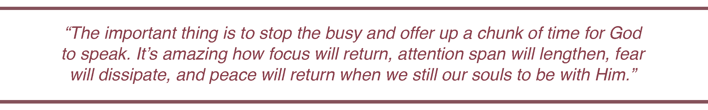 Stillness resets my thinking and puts God back in His rightful place as the King and controller of my life. In Psalm 62, David is surrounded by enemies. He feels all alone. “So many enemies against one man,” he mourns, “all of them trying to kill me. To them I’m just a broken-down wall or a tottering fence (vs. 3).” So David does what is totally counterintuitive. He doesn’t run around wringing his hands and trying to fight on his own. Nope. He comes to a full stop and “waits quietly” before the Lord. He remembers that God alone brings victory. When I am still, my perspective returns, and I draw closer to the Lord.
