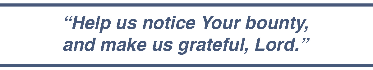 Father, forgive us for taking all of this for granted. Many on our planet go without, and we often complain about minor things like a grocery store being out of our favorite brand of grape jelly. Oh, help us to notice the bounty! Help us to have sharing hearts for those in our neighborhoods who are going without. Pull us away from self-centered entitlement and show us the blessings we have right in front of us. Make us grateful people, Lord, and help this month to have an increased awareness of all the beautiful gifts You have given us. In Jesus’ Name, Amen.