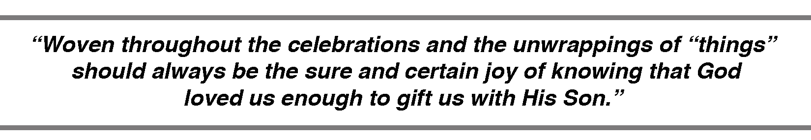 Heavenly Father, thank You for the gift of Your Son. Thank You for a season when we celebrate Your selfless giving. You gave to the point of death and endured separation, pain, and anguish so that we might be given eternal life with You. God in Heaven, we thank You for this indescribable gift! In Jesus’ Name, Amen.