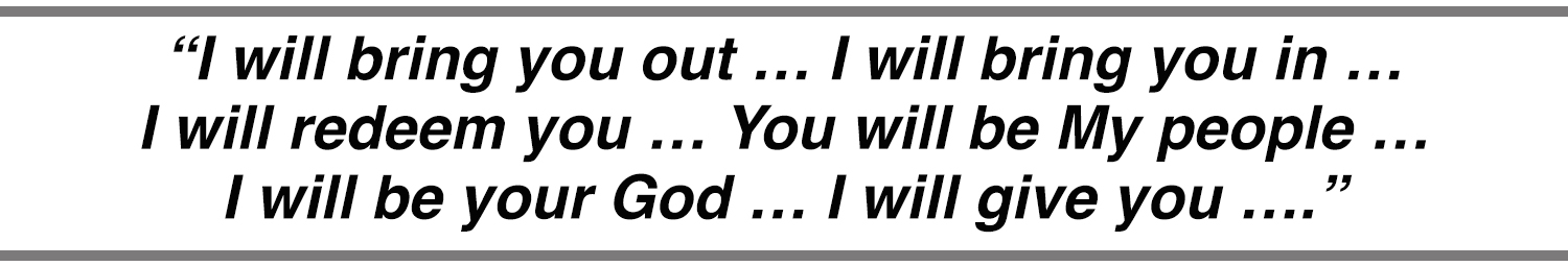 “Therefore say to the children of Israel: ‘I am the LORD; I will bring you out from under the burdens of the Egyptians, I will rescue you from their bondage, and I will redeem you with an outstretched arm and with great judgements. I will take you as My people, and I will be your God. Then you shall know the I am the LORD your God who brings you out from under the burdens of the Egyptians. And I will bring you into the land which I swore to give to Abraham, Isaac, and Jacob, and I will give it to you as a heritage: I am the LORD.’” —Exodus 6:6-8 NKJV (emphasis mine)