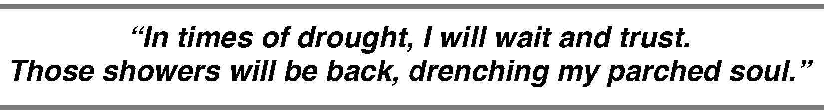 I know what I choose. In times of drought, I will wait and trust. I’ve lived long enough to know that those showers will be back, drenching my parched soul and filling every crevice with life-giving, refreshing water from the Source of life Himself. I’m actually in a happy rain-soaked patch at the moment—not just outside my window but inside my heart. Still, I know that I need to store up deep reservoirs of remembrance and trust so that when the droughts come, I can draw from a well that runs deep.
