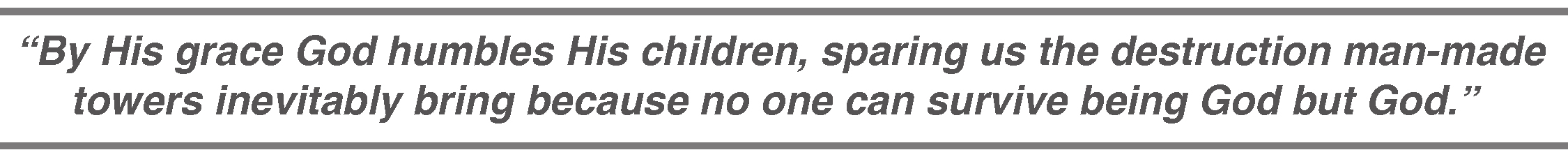What a common sin problem we have with those who built the tower of Babel. Trying to get to greater heights apart from God, we use man-made bricks instead of “The Cornerstone,” Jesus, to build high towers (or climb corporate ladders) so we can be our own god. Thankfully, God loves us too much to allow us to get very far without Him. By His grace, God humbles His children, sparing us the destruction man-made towers inevitably bring because no one can survive being God but God. Nonetheless, like Nimrod (Genesis 10) and Nebuchadnezzar (Daniel 3), we tend to climb to the top of the highest tower and say, “Look at all I have done!” Oh, that God would humble me way before I become self-important.