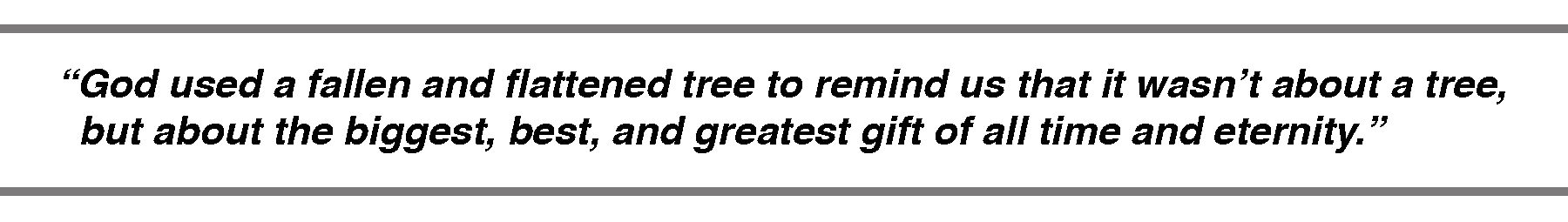 God used a fallen and flattened tree to remind us that it wasn’t about a tree, but about the biggest, best, and greatest gift of all time and eternity. It was about the sending of His son, not to be born as a baby, but to be born as the Sacrificial Lamb who takes away the sin of the world. He came to die that we might live. We had forgotten that!