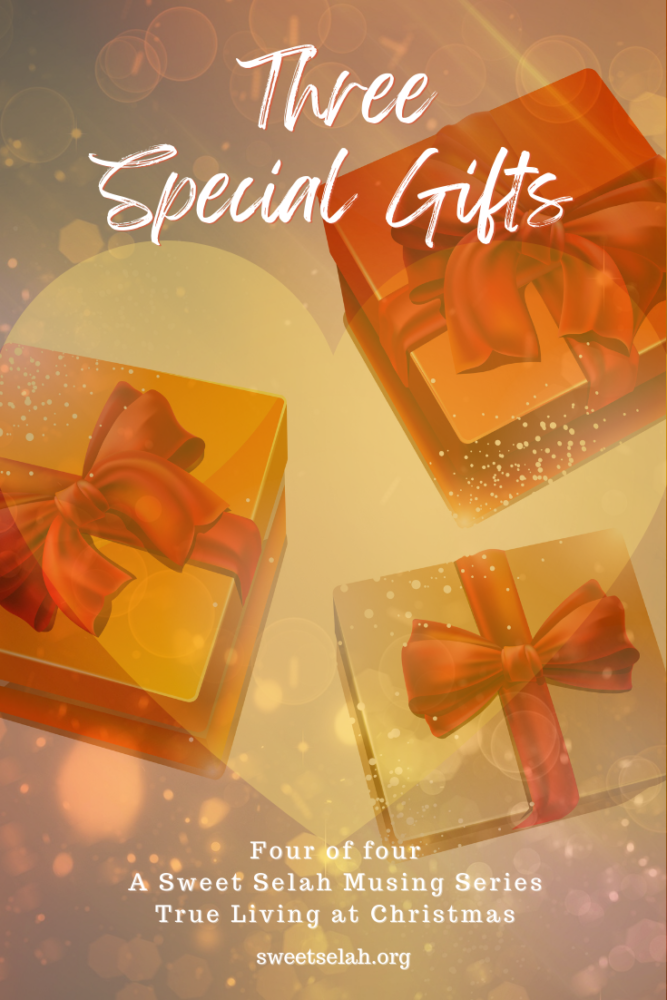 I think back to the three special gifts given to Jesus’s family. Mary and Joseph were certainly not wealthy, and I can only imagine their great surprise when three stately men, the Magi, or wise men as we know them, showed up … and bringing gifts. Their gifts of love were fit for a King: gold, frankincense, and myrrh. Did you ever wonder if these were given in God’s perfect, loving foresight to support this poor, refugee family and provide for them as they lived in Egypt those years?