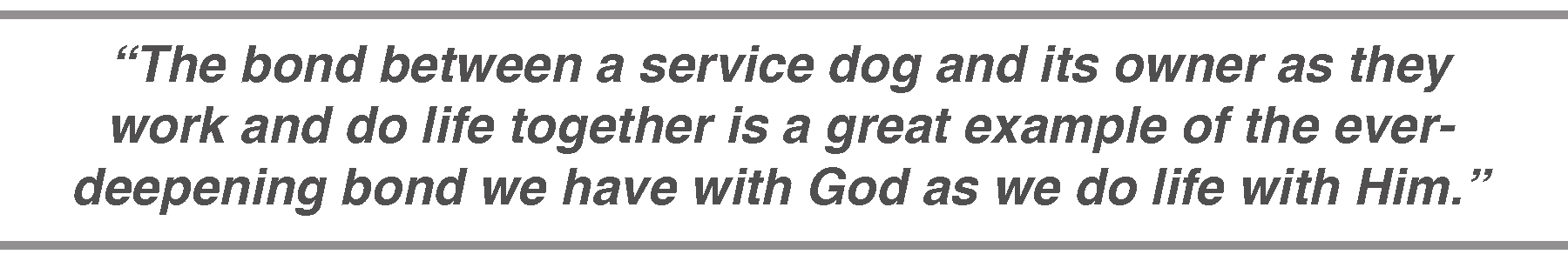 The bond between a service dog and its owner as they work and do life together is a great example of the ever-deepening bond we have with God as we do life with Him, as we cultivate and practice the disciplines of our Christian faith. The Psalmist says that our reward is that we will be refreshed—and an unending refreshment to others. We will become abundantly fruitful for Christ. We will be “Father-Blessed!”