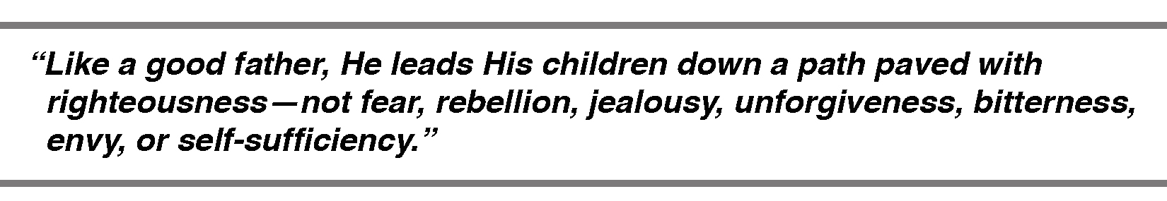 As David unfolds His relationship with the Lord in Psalm 23, he reveals his hope. “He leads me in paths of righteousness for his name’s sake.” For His name’s sake, He leads. Like a good father, He leads His children down a path paved with righteousness—not fear, rebellion, jealousy, unforgiveness, bitterness, envy, or self-sufficiency. In verse one, David proclaims that the Lord is his Shepherd, therefore, he shall not want, because a shepherd always takes care of his sheep. David took comfort in this, and so can we.