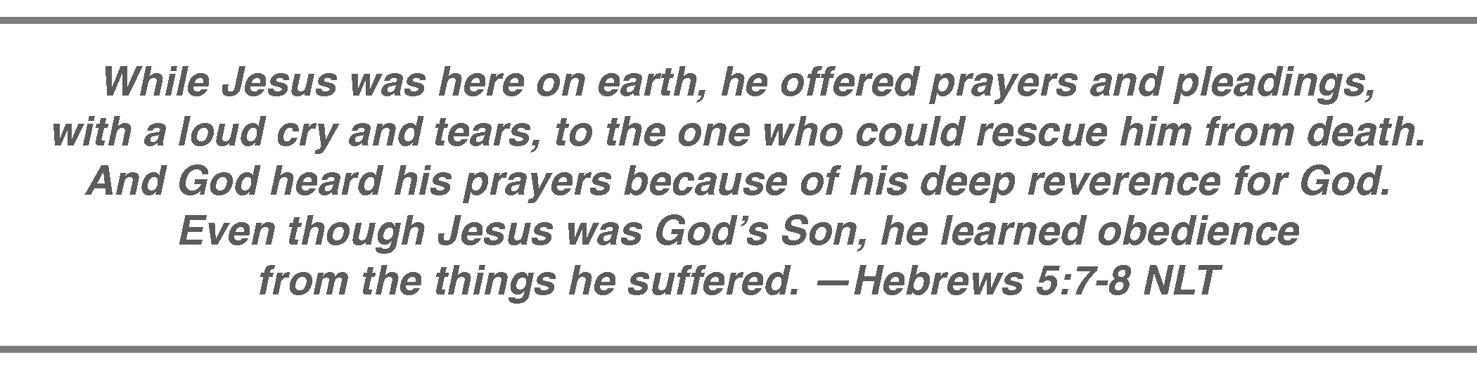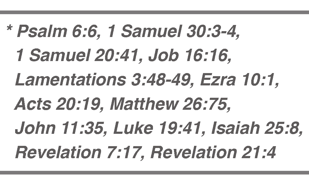 The Bible records many, many instances when good people shed tears. Here are just a few of God’s people recorded in Scripture as weeping: David, Jonathan, Job, Jeremiah, Ezra, the Israelites as a group, Paul, Peter, and Jesus.* Yes. Jesus cried, and not just once. He wept at the grave of Lazarus even when He knew He was about to raise Lazarus from the dead. He wept over Jerusalem—and, in the Garden of Gethsemane, He was in deep distress over His coming crucifixion. Hebrews has a poignant verse about this.