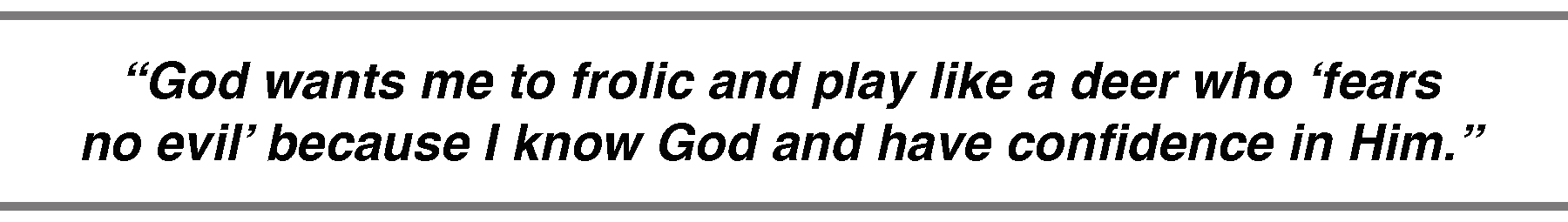 As hard as that was to hear, I wanted to live in freedom. I remembered what Paul wrote in Galatians, “It is for freedom that Christ has set us free. Stand firm, then, and do not let yourselves be burdened again by a yoke of slavery” (Galatians 5:1 NIV). Though Paul was referring to legalism and living under the law, I can also be enslaved by my fears. Yet, God wants me to frolic and play like a deer who “fears no evil” because I know God and have confidence in Him. Yes, quite possibly a lion is prowling around, trying to find something to eat. I am aware. But I also have a heavenly Father who loves me. He is not an alcoholic or unpredictable like my earthly father. Rather, He is faithful, loving, patient, and safe. He is my fortress.