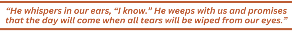 Here’s what makes it easier for me: The same God who allows me to go through hard seasons is the One who distilled Himself as a man, the Son of God, and entered our broken world. He felt what we feel. He was homeless. He relied on God’s provision through various people, even for food. His “job” as an itinerant preacher brought in no regular salary. He wept while He lived among us. He groaned. He was, indeed, “acquainted with deepest grief.”