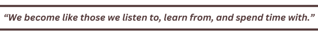 Still, when I started art lessons at a local gallery, I underestimated the influence of my teacher. Yes, I learned how to paint with oils, use different brushes and brush strokes, and how to mix colors. However, after a while, I realized that my paintings looked more and more like my instructor’s works. I’m not sure why I was surprised. After all, she told me which brushes to use and how to hold them, which strokes to make for a particular effect, and how to use a simple color palette. Nevertheless, the subsequent similarity in our work amazed me. In short, what I experienced with her proved what I knew to be true in other areas of life—we become like those we listen to, learn from, and spend time with.