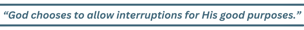 Today’s Bible passage reminds me of such an important truth: God plans my days; I don’t. He chooses to allow interruptions for His good purposes. Often, it’s to stretch my faith, shrink my selfishness, or trim my sails when I erroneously think I am in charge of myself. God asks me to trust Him not only with big disruptions like moving, illness, or death but also with the little things like a husband who can’t find the scissors or a dog who needs to be walked. All my days and all the interruptions are numbered and ordained by the One who loves me most of all. I truly want to behave better when interrupted.