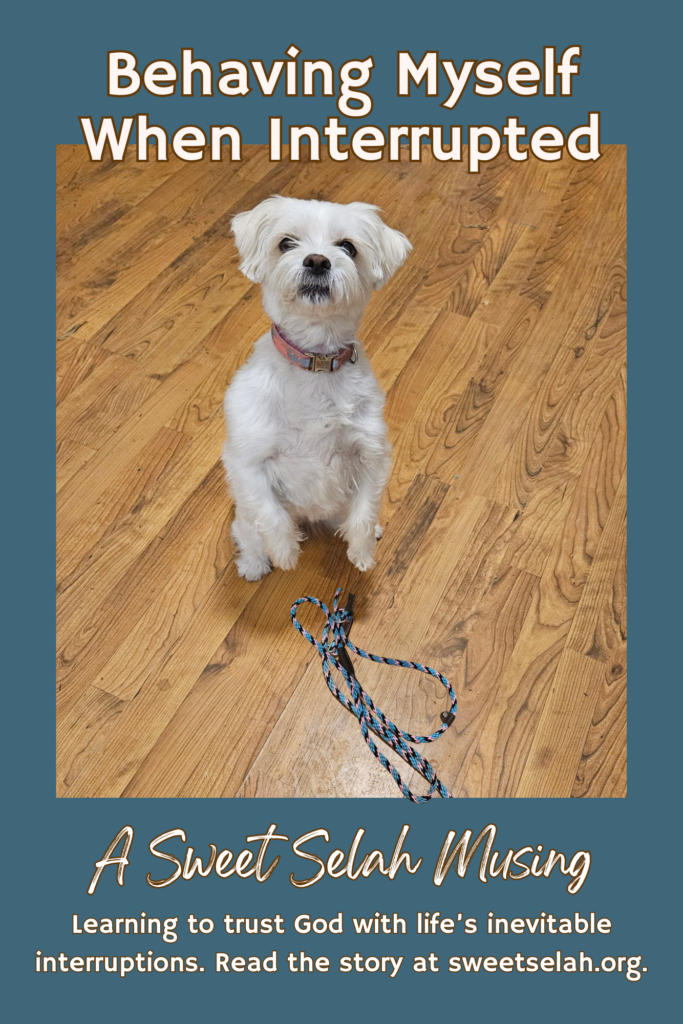 Because I favor “sameness,” I do not respond well to interruptions. When my little dog Bella barks to go outside, my first response is not prompt solicitude and helpfulness. Sadly, it is often aggravation because inevitably, I’m in the middle of something when she needs me. But need me, she does, and off I trot, mustering kindness for my pup and letting her out. Even when interrupted by my most favorite person in the entire world—my husband Ray—I’ve been known to grumble a wee bit before responding.