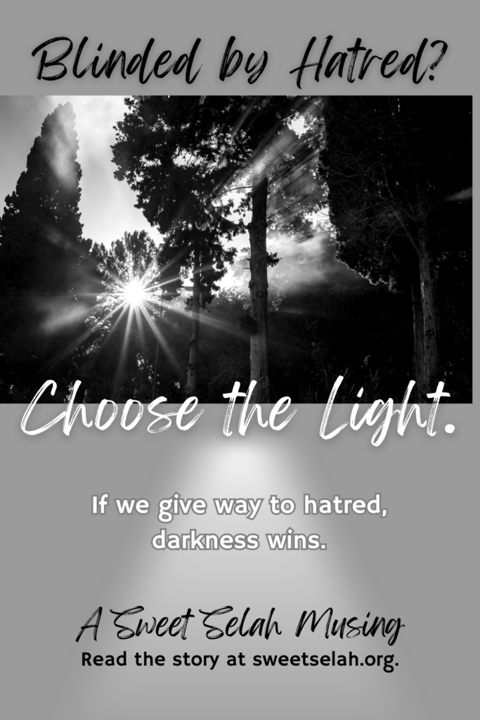 All of us were made by God and can be used by Him in mighty ways to serve and help in this broken world. God is able to redeem terrible people and turn them from darkness to light. When we notice hatred creeping into our thoughts and minds, we must answer the question: Will I choose hatred and blindness? Or will I bring this enemy to the Light and pray for that one to find healing for their troubled soul and peace in Christ?