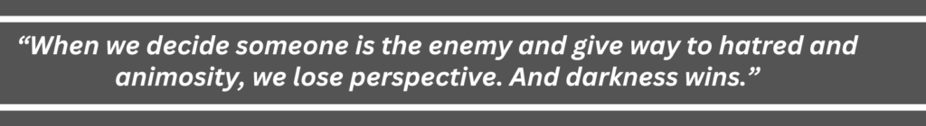 I came across this verse recently in John’s letter to Christians undergoing persecution, and the phrasing intrigued me. “But anyone who hates a fellow believer is still living and walking in darkness. Such a person does not know the way to go, having been blinded by the darkness” (1 John 2:11 NLT). When we hate a fellow believer, we walk in darkness. Hatred literally blinds us to nuance and keeps us from seeing the person clearly. When we decide someone is the enemy and give way to hatred and animosity, we give up clarity and paint them as we would the bad guy in a superhero movie. We lose perspective. And darkness wins.