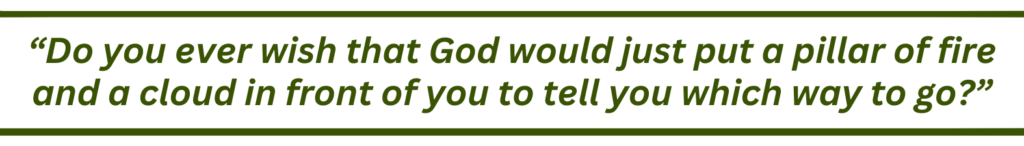 Do you ever wish that God would just put a pillar of fire and a cloud in front of you to tell you which way to go? Or that He’d have specific directions written down with your name on them? “Donna, go here! Turn there! Do this! Don’t do that!” Sometimes, we receive a direct answer and strong reassurance simply by praying once. At other times, we pray, and we pray, and we pray. We search the Scriptures, seek wise, godly counsel, and pray some more, and still the answer eludes us.