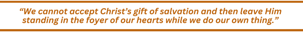 In the day-to-day, it means that we cannot accept Christ’s gift of salvation and then leave Him standing in the foyer of our hearts while we do our own thing. Instead, as Lord, He now has full access to every room, closet, and drawer. Every book, movie, and album we read, set our eyes on, play in our mind, or tune our ears to is now Christ-ruled. We now choose to make every recess and shadow of our heart available for His searching, cleansing, and reigning.