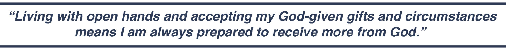 Through all this discovery, I have learned that God fulfills his purposes His way, and I can rest in that because God doesn’t make mistakes, He loves perfectly, and He’s the best parent ever. Therefore, living with open hands and accepting my God-given gifts and circumstances means I am always prepared to receive more from God. He moves in and through us to mold us more and more into the likeness of His Son. But that kind of Kingdom living is possible only by abiding in the Spirit, which is so evident in the life of Paul.