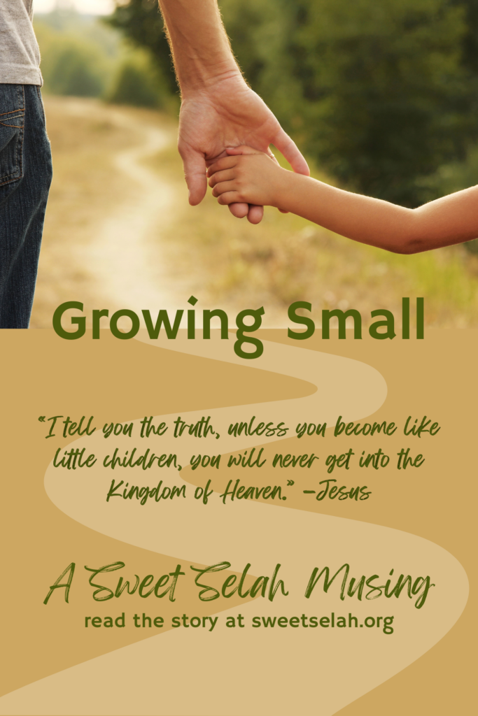 I no longer have to be in charge. What a relief! A child relies on parents to feed them, clothe them, and direct their days. They aren’t worried about paying the bills, the rising cost of health insurance, or the tightness of the daily schedule. A child just goes with the flow. In a good home, they are fed regularly, treated to snacks, disciplined when needed, allowed to play and learn and grow, and made to rest when a nap is needed. When I work on growing small, I remember my dependency on God and rest more in His sovereignty in my daily life.