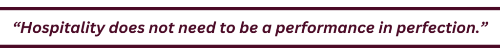 Warmth. The best hospitality comes with genuine delight in seeing a visitor’s face, wanting them to enter and be loved and cared for. A big smile and an “I’m so glad you’re finally here. You must be so tired after your trip.” Help with their luggage. All say that—far from being an inconvenience—you are wanted, and you bring joy to the home simply by arriving.