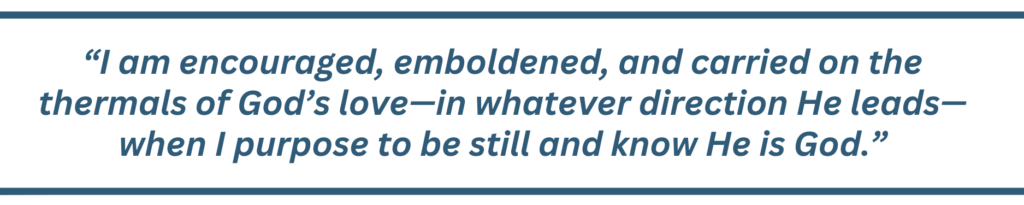 Having pondered this thing called faith that comes by hearing God’s Word, I am even more convinced of the importance of practicing stillness with God. How can I “hear” God while distracted, busy, and worried? How will I recognize His leading if I don’t know His character? In contrast, I am encouraged, emboldened, and carried on the thermals of God’s love—in whatever direction He leads—when I purpose to be still and know He is God.