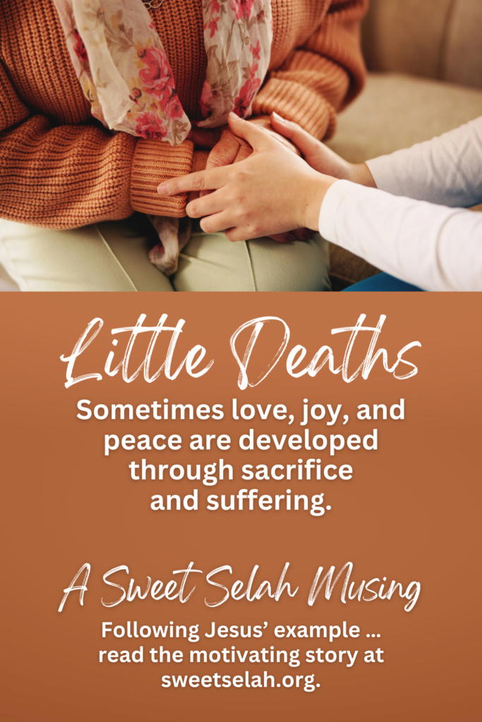 Not all sacrifices are huge, and not all suffering is momentous. A whole lot of my life as a wife and mother and friend is made up of—not the grand gestures, but what I think of as “little deaths” to self. For example, just the other morning, I was deep into my quiet time (a worthy and holy activity, yes?). Ray had finished his devotions early, was putting on his coat, and preparing to go out the door to his job as a teacher at a local Christian school. Now, when Ray leaves each morning, I make him a coffee thermos “to go” and hand him a lunch with a little hand-written love note and a kiss. It’s our routine. However, this morning, Ray had finished early, and I wasn’t yet done with my quiet time. I wanted him to go away while I finished up. He was annoying me, standing there hoping for his kiss and coffee. Humm … would I die a “little death” and lay aside my Bible to send him on his way with love, or not? I kissed him, and he got his coffee, but I marveled at how hard it was—dying to self even in something as minor as that.