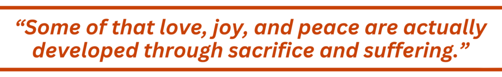 Jesus did not make it sound all fun and easy to follow Him, did He? No. He told His followers right from the start that it would involve sacrifice and suffering. Yet, following Him also brings love, joy, peace … and so much more! Some of that love, joy, and peace are actually developed through the sacrifice and suffering.