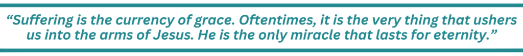 Having said that, please remember God’s economy is much different from ours. We cannot question His love based on our physical circumstances. Suffering is the currency of grace. Oftentimes, it is the very thing that ushers us into the arms of Jesus. He is the only miracle that lasts for eternity.