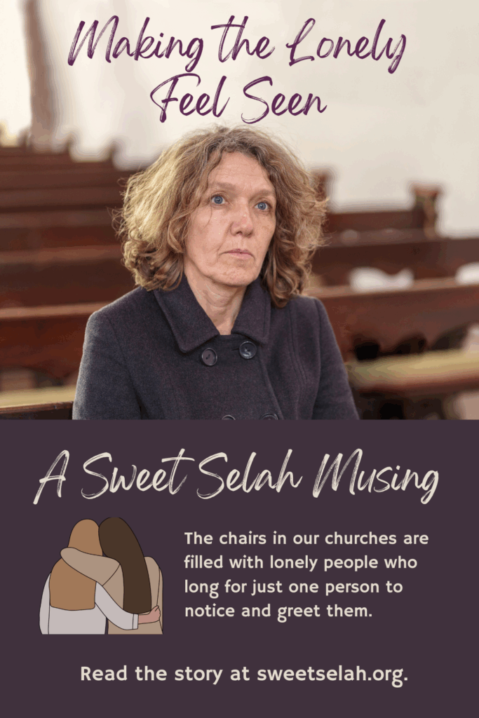 Father, help me to see the lonely, to stop, and to cause that one to feel worthy of being noticed. She has been created in Your image. Remind me that by reaching out to her, I am welcoming You. In Jesus’ Name, I pray, Amen.