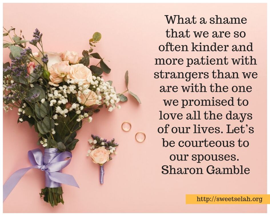 P is for Politeness. 1 Corinthians 13 reminds us that love is patient and kind. Not rude, nor demanding our own way. We should not be irritable, keeping a legalistic record of wrongs and letting the memory of them fester and stink. Nope. Won’t make a good marriage. Instead, we are to treat our spouse with great courtesy and kindness. When he wants to tell the same joke or discuss his favorite topic again, we practice patience and we listen. That’s what love does. What a shame that we are so often kinder and more patient with strangers than we are with the one we promised to love all the days of our lives. Let’s be courteous in our speech and actions in our homes. (Trust me, I’ve tried it both ways. Anger and irritation never make things better. Funny how that works. Anger stirs up anger. Kindness is more likely to produce kindness in return from our spouse.)
