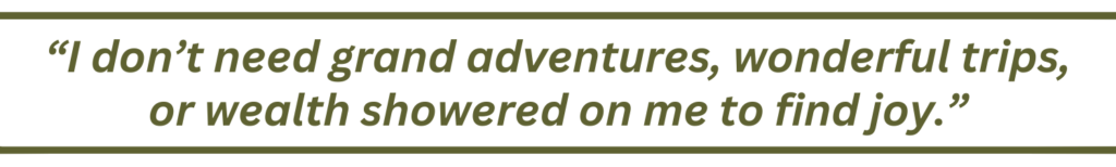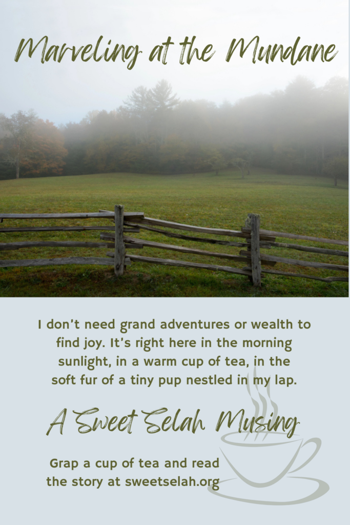 I don’t need grand adventures, wonderful trips, or wealth showered on me to find joy. It’s right here in the morning sunlight, in a warm cup of tea, in the soft fur of a tiny pup nestled in my lap, and the dimpled grin of a husband who has just cracked a corny joke.