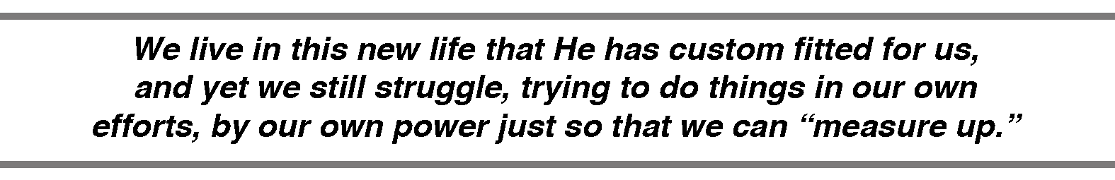 It’s the same with our lives when we become believers. We live in this new life that He has custom fitted for us, and yet we still struggle, trying to do things in our own efforts, by our own power just so that we can “measure up.” Real and lasting change comes when we fully yield to the Spirit who is already living and working inside of us.