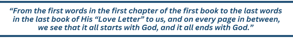 First and foremost, we see that the answer lies in His written Word. “In the beginning God …” (Genesis 1:1). “In the beginning was the Word … and the Word was God” (John 1:1). “The Revelation of Jesus Christ, which God gave Him to show His servants …. The grace of our Lord Jesus Christ …” (Rev.1:1; 22:21). From the very first words in the very first chapter of the very first book to the very last words in the very last book of His “Love Letter” to us, and on every page in between, we see that it all starts with God, and it all ends with God.