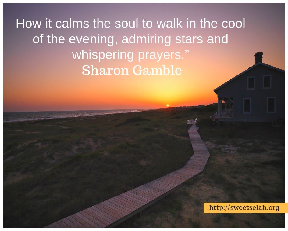 4) End the day with a short walk. How it calms the soul to walk in the cool of the evening, admiring stars and whispering prayers. Unload all your cares of the day on His capable shoulders with no cell phone in sight. Hear the crickets and feel the air. Savor.